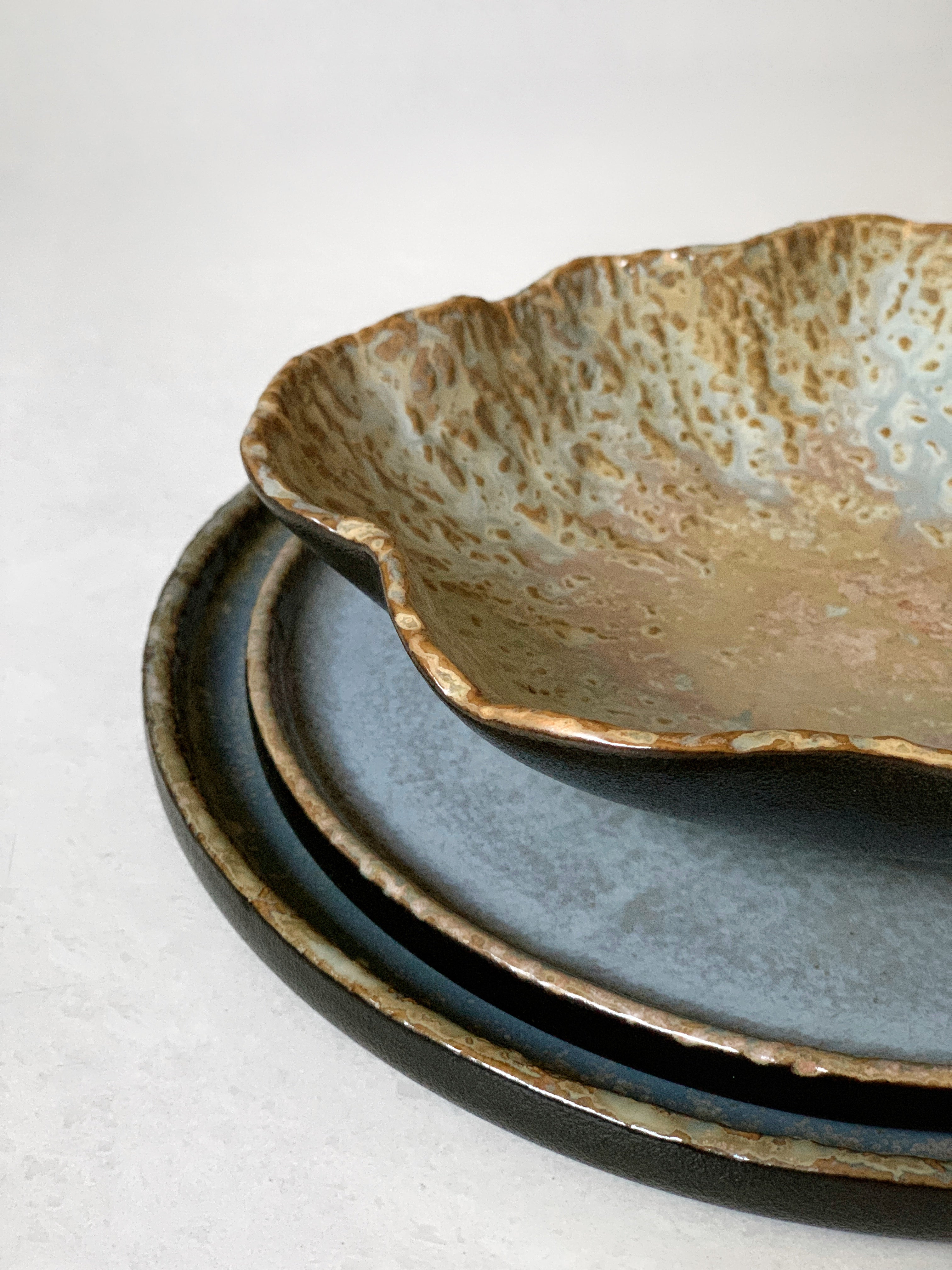 The Rock Collection captures the allure of natural textures. Every piece from bowls to plates boasts the perfect combination of matte coal black textured rims and a mineral-like glazed interior.