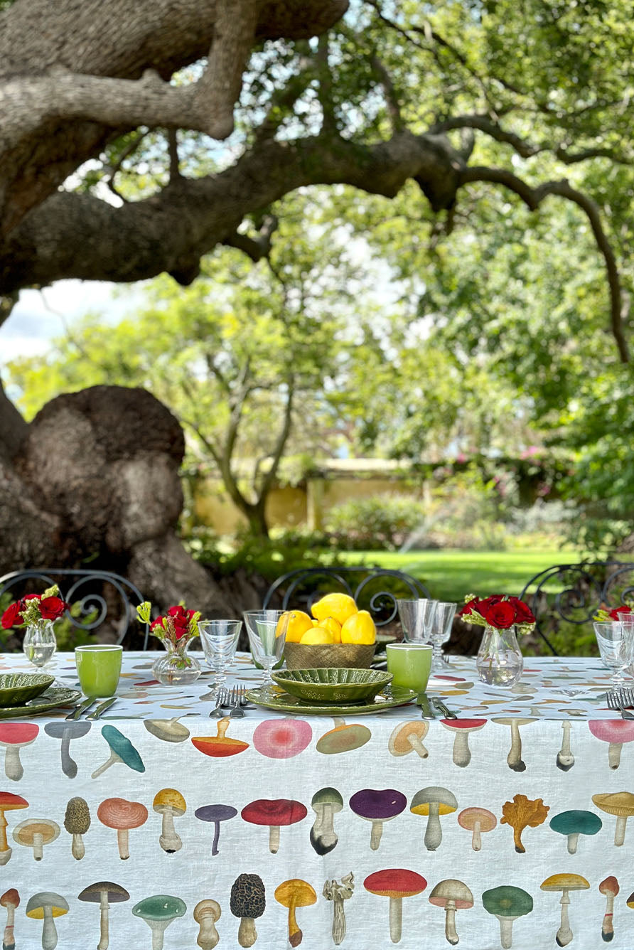 Reimagined from 18th and 19th century illustrations in John Derian's  extensive archive, a vintage array of mushrooms dance across this spirited table linen in riotous shades. Set on a fresh white, formed as a kaleidoscopic vision of nature's edible forest floor finds.