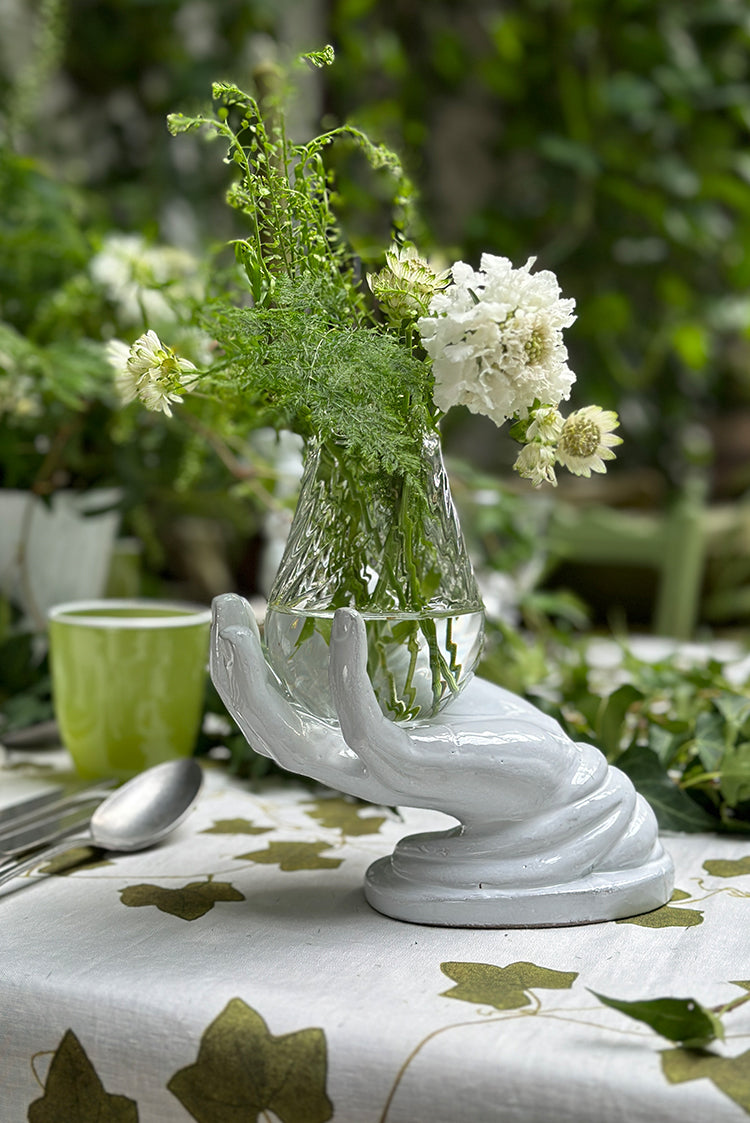 Ivy has virtues we should all celebrate, a constant, familiar mainstay of many a home, our gardens are greatly enlivened by an encouraged Ivy that shoots up a wall. With bountiful five pointed stars for leaves, dense, dark and thriving, Ivy possesses an almost magical quality. A flourishing Ivy is an enchanting place for wildlife to come home and roost. The perfect inspiration then, for this new table linen, as we encourage friends and families to gather at the table.